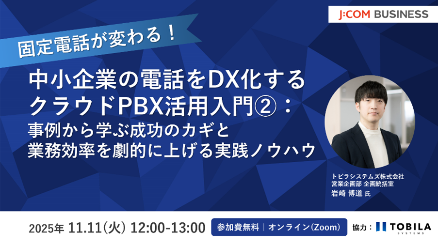・内容:中小企業の業務効率化やコスト削減が求められる中で、「固定電話」による場所の制約や非効率な一次受付、それによる販売機会の損失などが大きな課題となっています。本セミナーでは、これらの問題を解決し、電話対応をDX化する「クラウドPBX」をわかりやすくご紹介します。