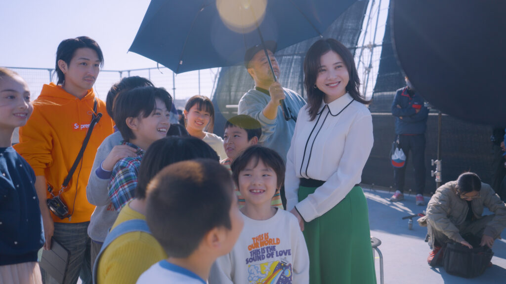 屋上での撮影ということで、青空が映える中、吉高さんはCMではおなじみの“ヨシタカ先生”の衣装で現場入り。長年同シリーズで共演している生徒役のみなさんとの久々の再会に、「見るたびに大きくなってる!」と笑顔を見せ、空き時間には手遊びをするなど、まるで本物の先生と生徒のように交流する姿もみられました。いざ撮影が始まると、吉高さんは監督とも入念な打ち合わせを行い、さまざまなパターンでセリフを話されるなど、細部までこだわる姿が印象的でした。