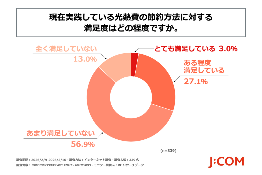 「現在実践している光熱費の節約方法に対する満足度」を尋ねたところ、「あまり満足していない」が56.9%で最多、「全く満足していない」が13.0%。合計69.9%と約7割が現在の節約方法に満足していないことが明らかになりました。「ある程度満足している」は27.1%にとどまり、多くの方が“節約行動をしているのに報われない”と感じている実態が浮かび上がりました。
