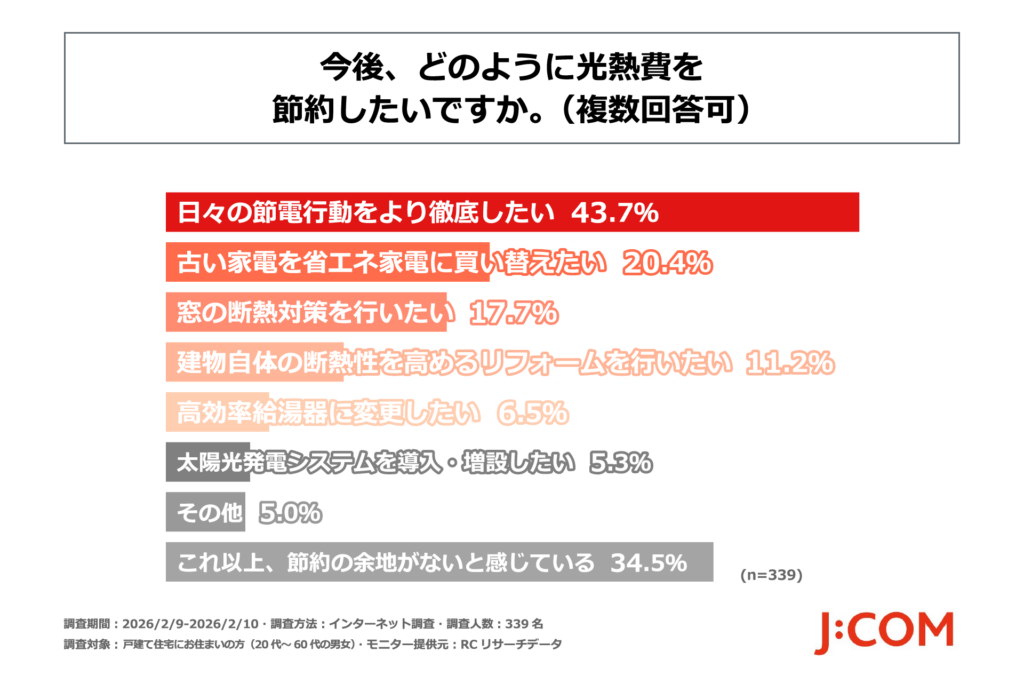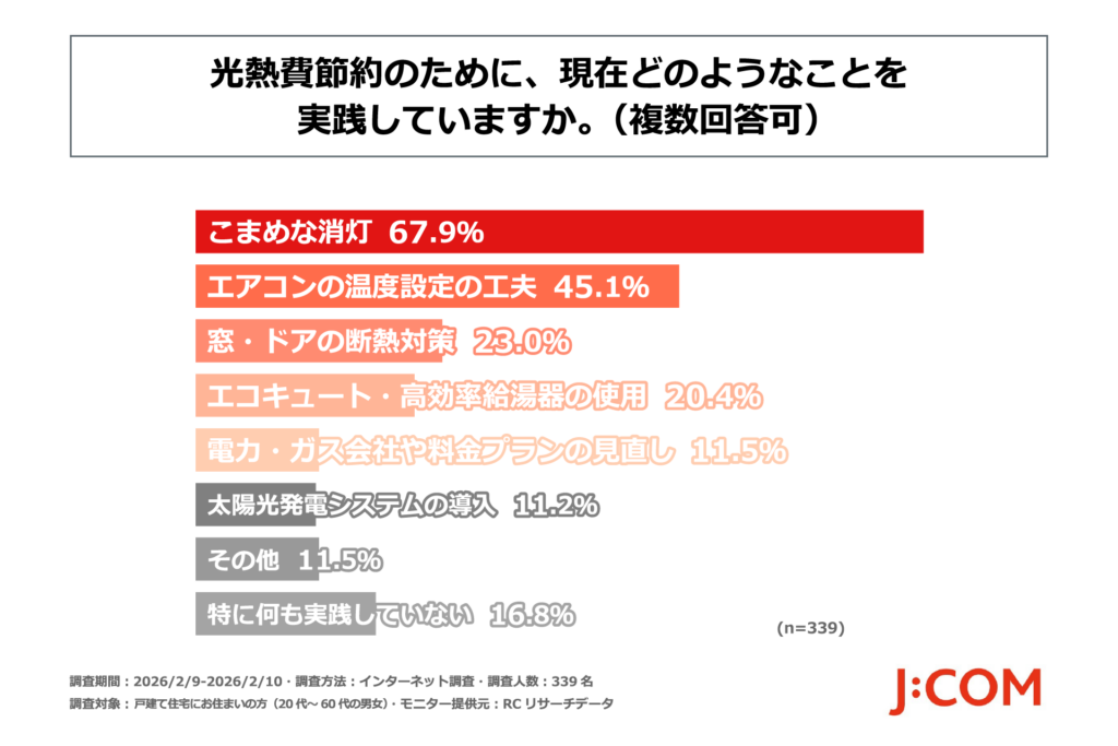 JCOM株式会社(J:COM、本社:東京都千代田区、代表取締役社長:岩木 陽一)は、戸建て住宅にお住まいの方(20代~60代の男女339名)を対象に、「戸建て住宅所有者の光熱費節約に関する実態調査」を実施しました。