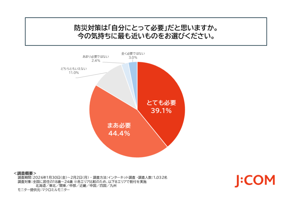 JCOM株式会社(J:COM、本社:東京都千代田区、代表取締役社長:岩木 陽一)は、日本赤十字社(日赤、所在地:東京都港区、社長:清家 篤)と連携し、若年層(全国に居住の18歳~24歳1,032名)を対象に、「若年層の防災に関する意識調査」を実施しました。